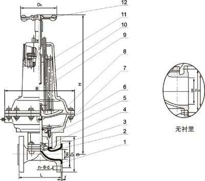 部件列表:1、阀体 2、阀体衬里 3、隔膜 4、阀瓣 5、下阀杆 6、阀盖 7、气缸 8、活塞 9、弹簧 10、气缸盖 11、上阀杆 12、手轮